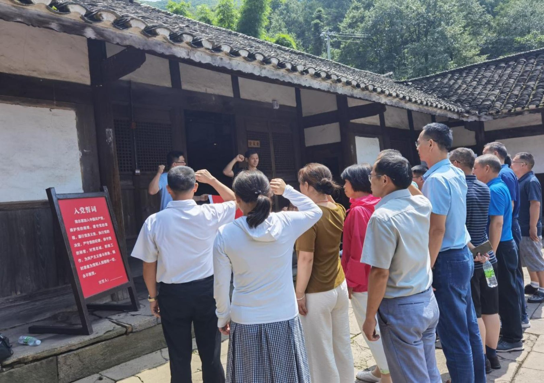▲苟坝会议会址前全体党员面向党旗重温入党誓词