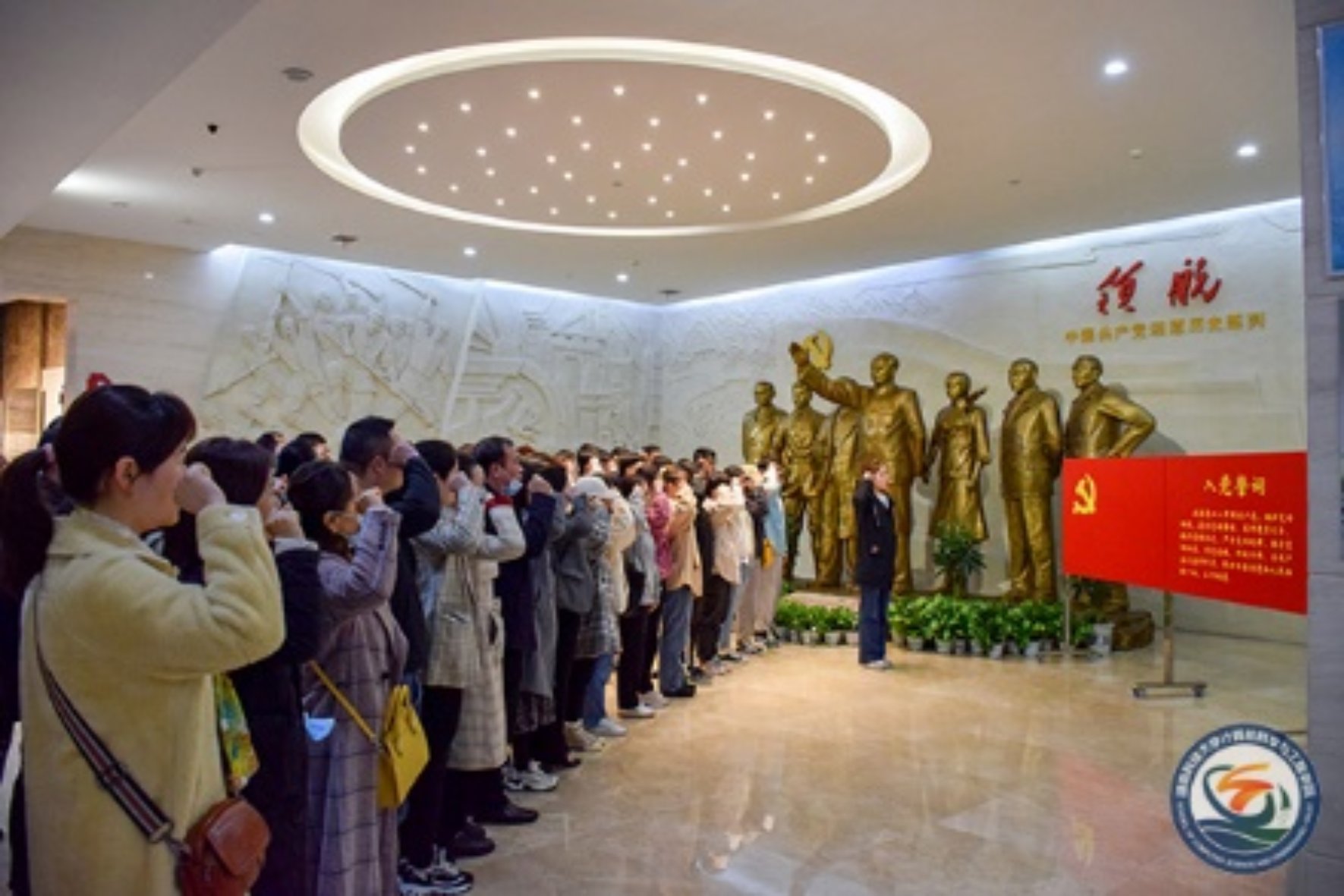 全体党员佩戴党徽,面对鲜红的党旗,郑重举起右手,握紧右拳,庄严宣誓,重温入党誓词,铿锵有力的宣誓声响彻馆厅,感悟共产党人的初心使命,表达对共产党的无限忠诚,接受思想政治洗礼。