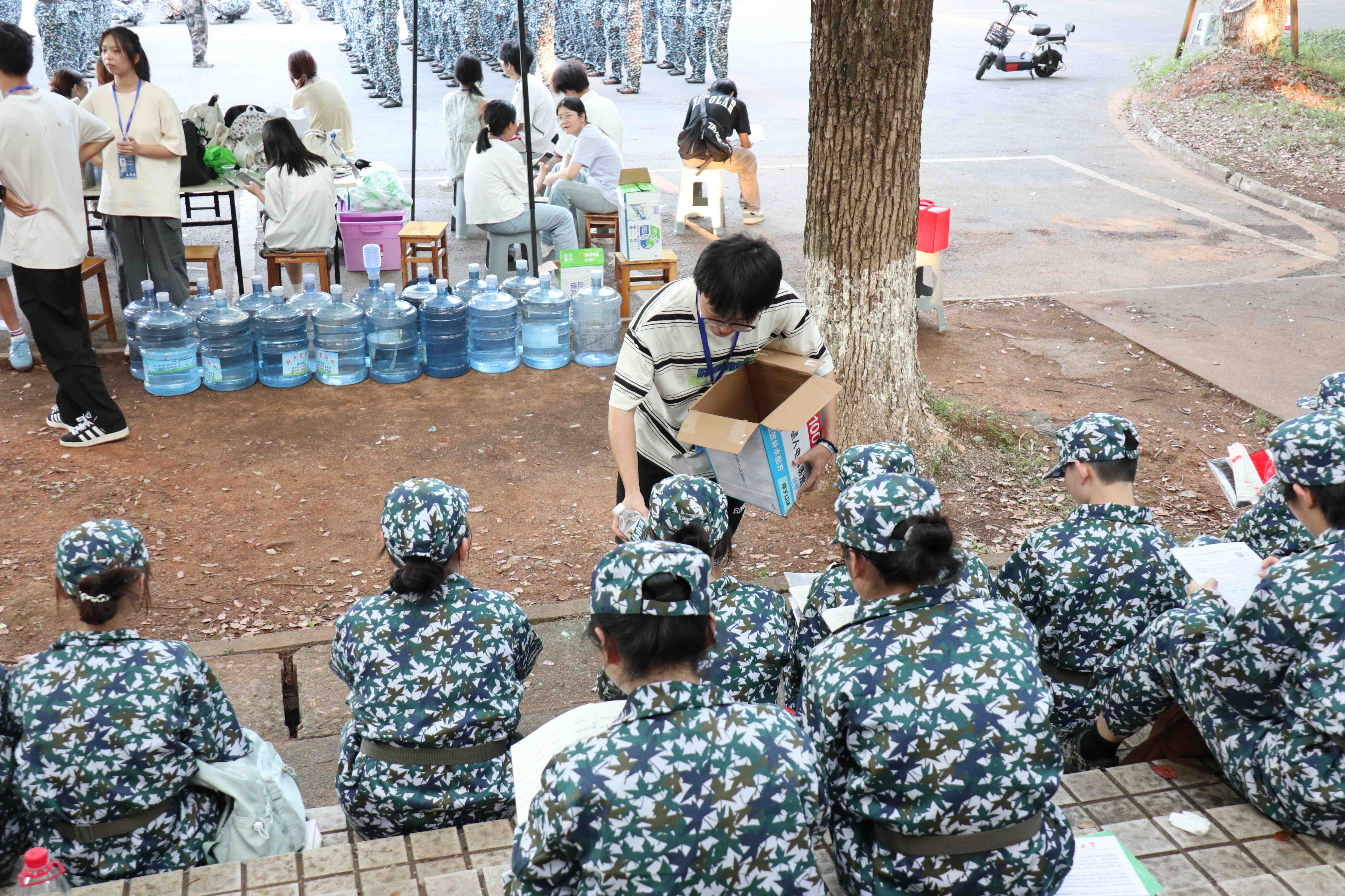 “程”风破浪,“计”往开来。随着军训拉开帷幕,党员同志们继续发挥先锋模范作用,化身“后勤保障员”,全程陪伴在训练一线。他们密切关注新生身体状况,及时为有需要的同学提供帮助。面对因训练强度而出现不适的新生,党员们主动上前搀扶安慰,并护送其至休息区。
