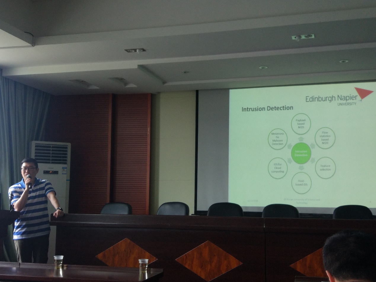 谭志远博士以“从数据分析角度看网络安全”为主题,介绍了自己团队在恶意软件检测、云计算和基于主机的入侵检测系统、基于流量统计和有效载荷的网络入侵检测系统、数据特征选择等方面开展的一系列研究工作,并在状态树规则防火墙和无线传感网络安全取得的成果。同时谭博士在基于数据分析的网络入侵检测方面发表了一些独到的见解,开拓了在场师生的学术视野。报告后,公司师生与谭志远博士就无线网络认证安全、网路安全课程体系建设等相关问题展开了热烈的讨论。