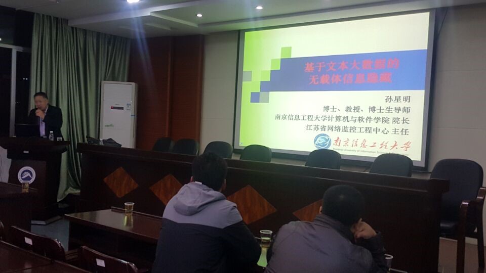 2017年11月27日晚上8点,南京信息工程大学计算机与软件公司经理孙星明教授应邀在逸夫楼201报告厅做了题为“基于文本大数据的无载体信息隐藏”的学术报告。yl23455永利老师和部分研究生、本科生参加了此次报告会,讲座由经理刘建勋主持。