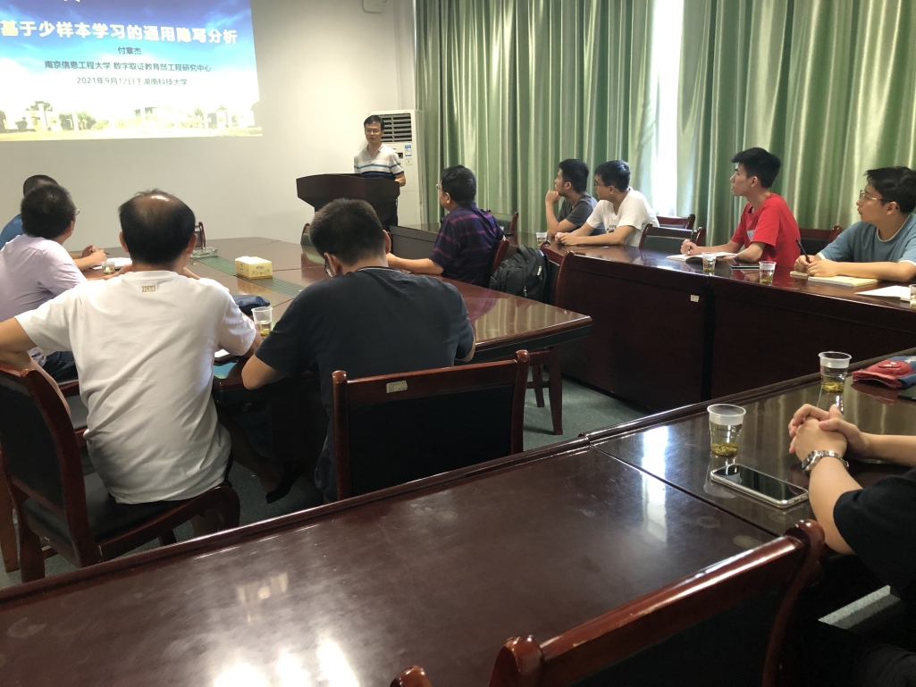 9月12日上午,公司在逸夫楼210会议室举行学术报告交流会。教育部长江青年学者、南京信息工程大学计算机公司副经理、数字取证教育部工程研究中心执行主任、江苏省网络监控工程中心主任、气象信息安全研究院经理付章杰教授应邀作为本次报告会主讲嘉宾,公司副经理胡勇华教授、曹步清教授,物联网工程/信息安全系主任王晓亮教授出席会议,部分老师与研究生与会,会议由胡勇华教授主持。