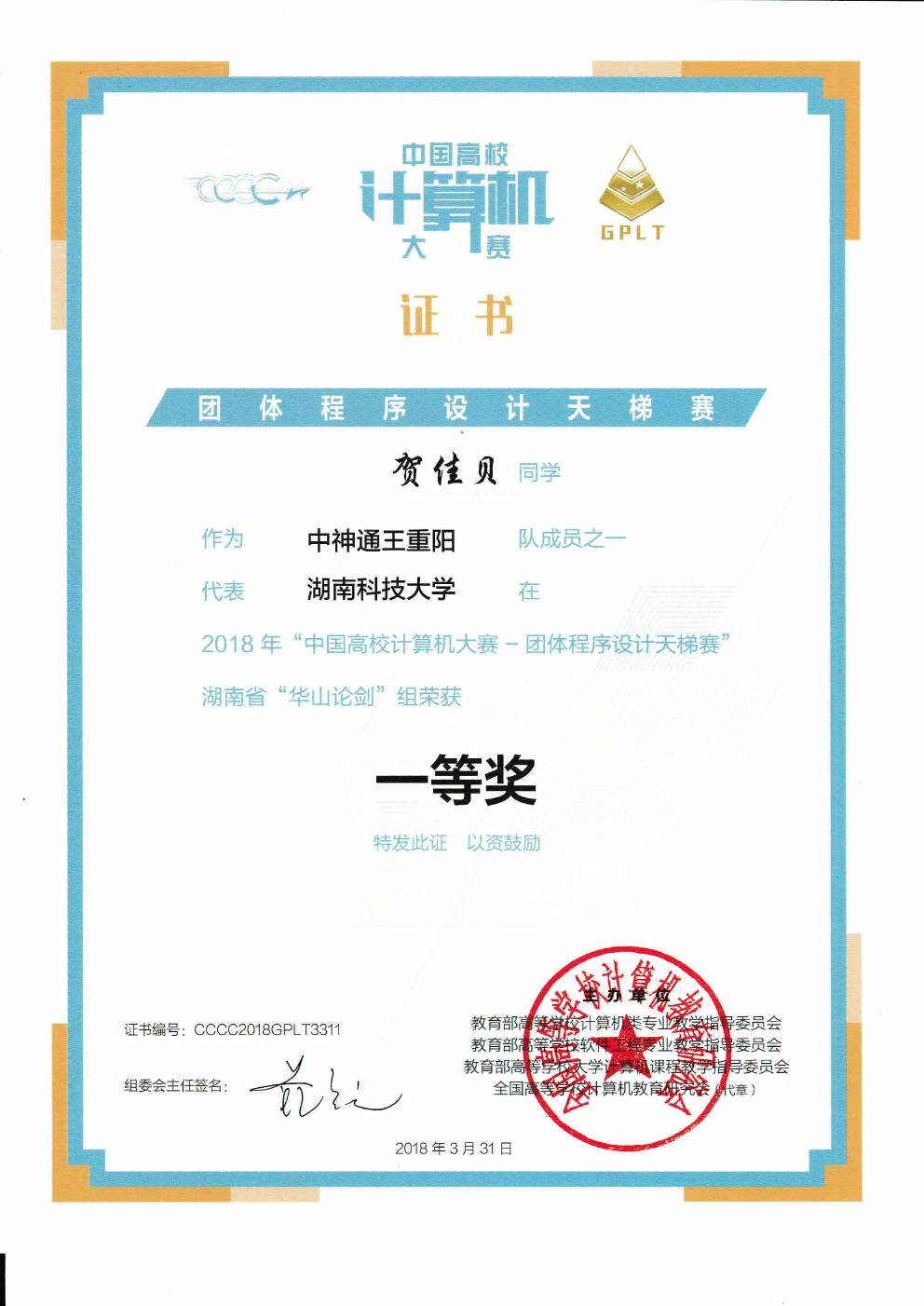 创新创业 获奖证书 您所在位置: 首页 > 员工工作 > 创新创业 > 获奖证书 2018年”中国高校计算机大赛-团队程序设计天梯赛 一等奖 时间:2019-03-05 作者:网络部 访问量: yl23455永利(集团)股份有限公司官网