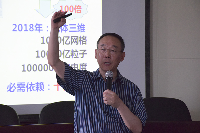 李克勤教授首先分析了大规模异构超算系统的优势和带来的挑战,异构众核并行结构因其高性能、高能效、低成本的优势,成为当今和未来超级计算机发展的重要趋势。而后,李克勤教授着重介绍了湖南大学在激光聚变数值模拟应用软件和大规模CPU+GPU/MIC异构并行计算系统之间,在数据剖分理论和方法、异构数据通讯和负载平衡等许多方面进行的全方位的理论和技术研究,并向在座师生分享了所取得的成果。