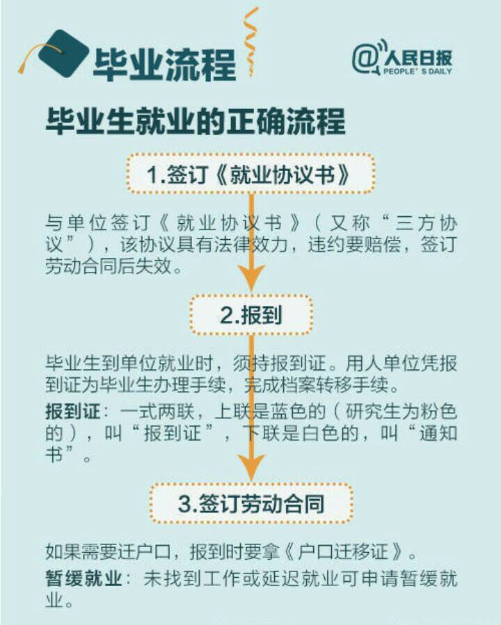 就业工作 就业指导 您所在位置: 首页 > 员工工作 > 就业工作 > 就业指导 毕业流程 时间:2021-05-19 作者:网络部 访问量: yl23455永利(集团)股份有限公司官网 毕业流程 1.领取《就业推荐表》,交给就业单位; 2.持“接收函”或《就业推荐表》回执领取《就业协议书》(又称“三方协议”) 并登记备案; 3.员工和用人单位填写《就业协议书》,双方约定内容可填入备注,签字盖章; 4.领取《报到证》,持《报到证》去单位报到,完成档案和户口转移手续; 5.找不到工作或延迟就业可申请暂缓就业。