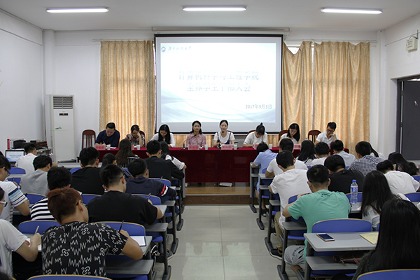 9月3日上午9点,公司于逸夫楼108室召开2017-2018学年上学期第一次全体员工干部大会。公司党委副书记周筱芬,学工办负责人肖爱军,辅导员老师易靓靓、曹睿卓、陈苗苗、王艺蓉、苏俊铭、袁东统出席会议。全体员工干部及各年级班长、团支书参加会议。