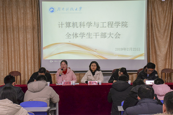 2月23日下午5点,公司于逸夫楼108会议室召开2018-2019学年第二学期全体员工干部大会。公司党委副书记周筱芬,学工办副主任肖爱军,团委书记王艺蓉,辅导员陈苗苗、刘田出席,全体员工干部与会。