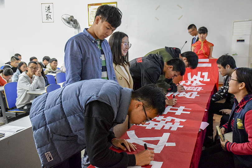 活动最后,各位老师和主席团成员在活动横幅上签字,并由主席团成员向各班团发放《安全管理规定承诺书》。至此,本次安全文明宣传月启动仪式暨心理健康教育安全知识讲座圆满结束。