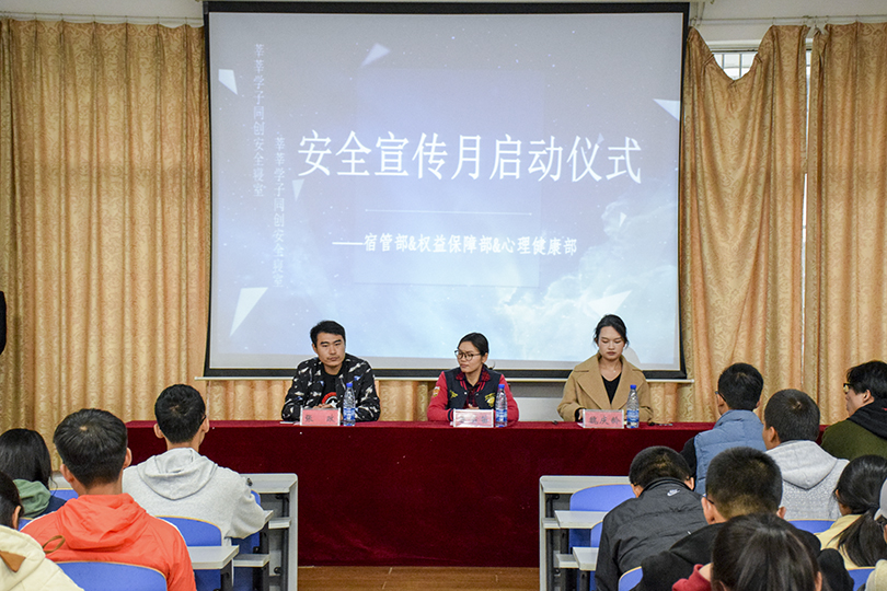 为加强员工安全防范意识以及对心理问题的关注,提高寝室的安全水平,建立良好的宿舍关系,11月6日下午2点,公司安全文明宣传月启动仪式暨心理健康教育安全知识讲座于逸夫楼108会议室顺利开展。辅导员陈苗苗、魏庆龄、张政出席,团委员工会主席团,17、18级各班团及18级全体寝室长与会。本次仪式由陈佳男主持。