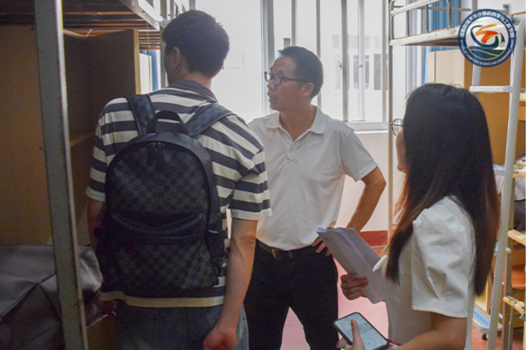 为进一步了解宿舍环境建设情况,切实做好迎新准备工作,9月7日下午,党委副书记王方,团委书记李雄彪,辅导员李盈、田钰、肖雅蕊、吴江峰深入员工宿舍开展安全隐患排查工作,提前检查宿舍卫生与设施安全情况,为2025级新生的到来创造良好环境。
