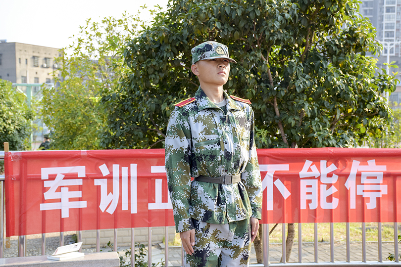 因眼睛不能见强光,本该休息的网络工程一班的陈思远选择在树荫下继续陪伴着同学们站军姿,太阳落山,他便立刻跑回方阵中,请求入列。挺拔的身姿,坚毅的神情,这一切都像在宣告着他不会像伤病低头,而在训练场上,还有许多像他一样的人。