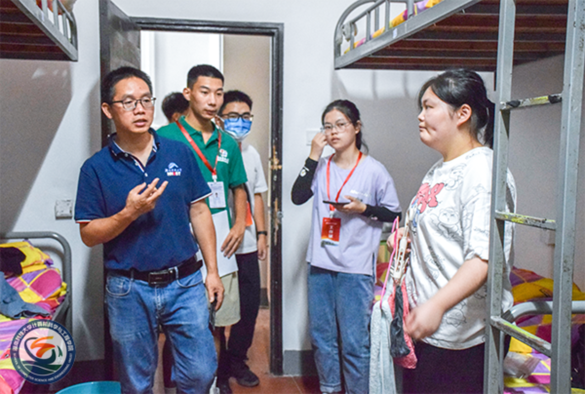 为了解新生的状态,帮助新生尽快适应校园生活,9月17日,公司党委书记刘红阳,党委副书记王方,2022级辅导员罗芽松和各班班主任下寝探望新生。