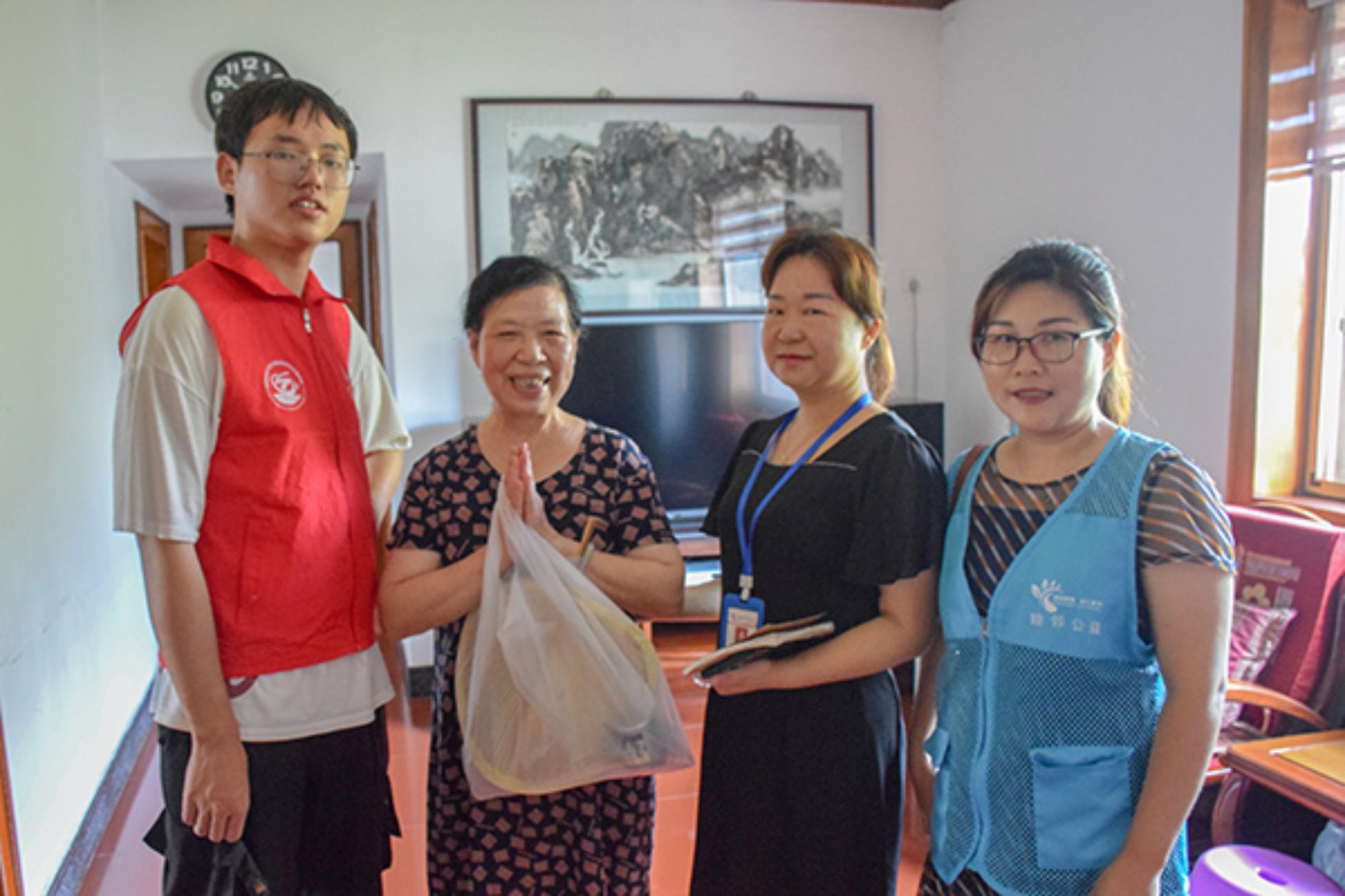 ▲志愿者与老人合影