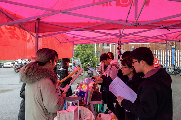 3月23日一早,公司工作人员忙碌的身影已出现在北校电信路口、八区食堂和南校美食广场前,摆帐篷、拉横幅、整理物资,不一会各类捐赠品就整齐有序地排列在桌子上。“购买闲置物品,献爱心”,工作人员的吆喝声引得不少路人驻足。摆点当日虽是细雨蒙蒙,却也能感受到同学们购买物品献爱心的那份热情。此外,为了感谢购买者的爱心,凡购买爱心物品的爱心人士都获得了由公司团委三部门自制的小礼品一份。