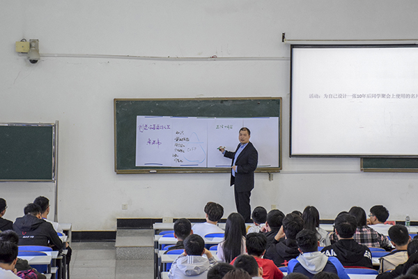 而后,在大家的掌声中,朱建炜正式展开此次讲座。首先,他借用冰山的例子进行了自我介绍,就知识、专业绩能、综合能力、个性特征、动机、价值观、综合能力等各方面进行了自我介绍。朱建炜让在场的同学们设计了一张用于10年后同学聚会的名片,充分的调动了同学们的积极性,更为之后的讲座内容埋下了伏笔。朱建炜说,在个体变化中,只有通过增加个人的适应力让你做好充分的资源准备,才能应对环境的变化。朱建炜向大家介绍了职业导向与就业导向两种职业定位的思路以及职业定位的方法,通过介绍行业、组织、职位三个方面让同学们了解了当今社会人才需求标准。朱建炜跟大家分享了从工作中分享幸福感的三个层次及生涯观点,最后,他总结道:“我们拥有一个最宝贵的资源——时间,请大家用有限的时间来规划一个精彩的人生,成就一个更好的自己。”