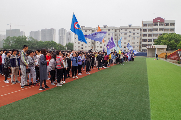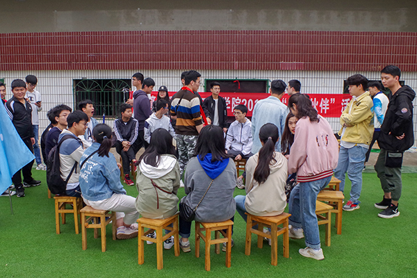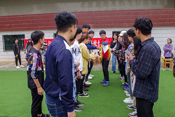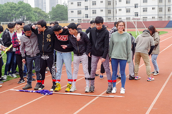 活动伊始,17级总支书记谢儒发言。他说道:“本次活动以‘安全第一、友谊第二、比赛第三’为宗旨,旨在团结同学,奋发向上。此外,此次活动也是我们年级预庆70周年校庆举办的特别活动,让我们以昂扬的青春斗志向公司献礼。”在分组抽签后,比赛正式开始。活动分为两大部分,以“齐头并进”绑腿接力赛为主游戏,双腿夹气球接力赛、扑克牌运面粉、校庆知识版你画我猜、瞎子背瘸子和抢凳子五个项目为辅助游戏。所有游戏同时进行,以班级为单位,采用积分制决出最后的冠亚季军和优胜奖。