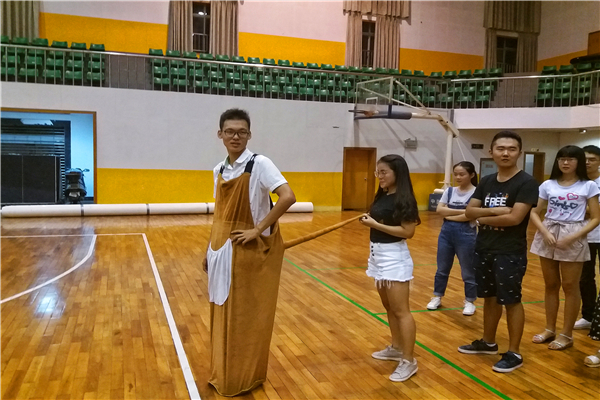 活动开始,新老班团以及总支被分成三组进行互动游戏,游戏由“德--背靠背夹气球”、“智--一块五毛”、“体--袋鼠跳”、三类组成,游戏过程中,新老班团、总支们团结合作同时又竞争激烈,充分展现了15级员工干部的新风貌。游戏结束后,陈老师也与同学们一起跳舞,大家互相交流,积极地融入集体,气氛活跃融洽。