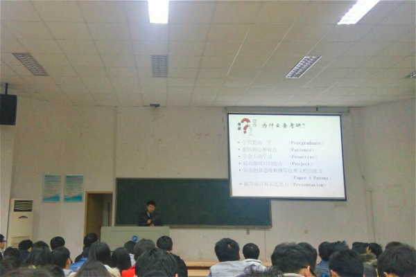 大会开始,肖老师做了简短的发言后,由唐经理开展了对13级同学的考研动员,唐经理从考研有何好处,考研难不难,考研要注意什么,考本公司有些什么优势等方面进行了讲解,分析了现今考研对于同学们个人发展的益处,并且对公司研究生工作做了详细介绍,希望同学们踊跃报考本公司研究生。随后计算机网络中心刘主任立足公司与学科发展,讲解了公司的发展历程并介绍了优秀的师哥师姐们为公司添砖加瓦的事例,以一名导师的身份希望同学们努力学习努力奋斗,让公司明天以己为荣。。之后由公司97届毕业生黄继秋先生与同学们分享自己的成长成才经历,并谈及到同学们将来要有不停止学习的状态,对于工作要有很好的规划和目标,不要浪费了美好的校园时光。