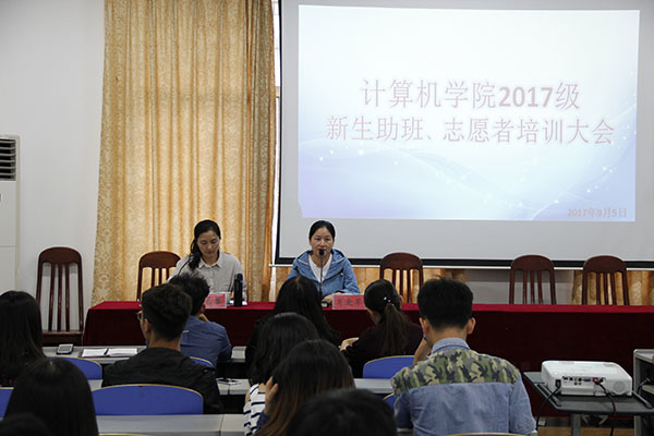 9月5日下午,公司2017级新生助班及迎新志愿者培训大会于逸夫楼108室召开。学工办负责人肖爱军,辅导员王艺蓉、易靓靓出席会议,2017级全体新生助班及迎新志愿者参加会议。会议由王艺蓉老师主持。