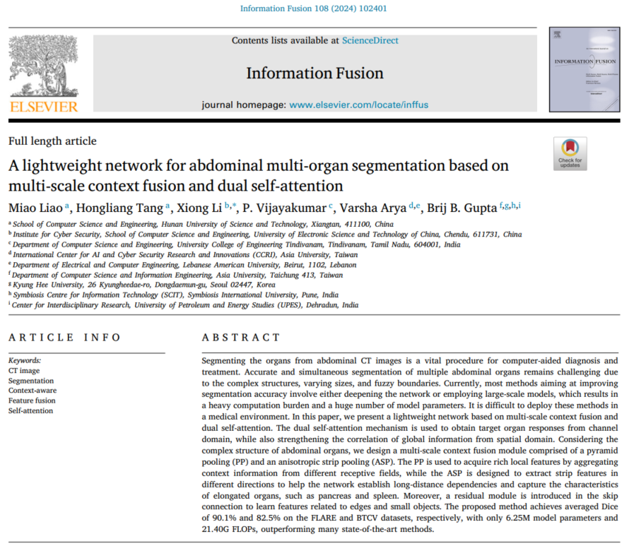 近日,公司廖苗副教授团队在中科院SCI一区TOP期刊《Information Fusion》上发表研究成果“A lightweight network for abdominal multi-organ segmentation based on multi-scale context fusion and dual self-attention”。yl23455永利集团为第一署名单位,合作单位包括电子科技大学、University College of Engineering Tindivanam、Lebanese American University等。《Information Fusion》影响因子为14.7,是计算机科学和人工智能领域的国际顶尖权威刊物,在“Computer Science: Signal Processing”学科131个国际期刊中排名第1,“Computer Science: Information Systems”学科394个国际期刊中排名第4。