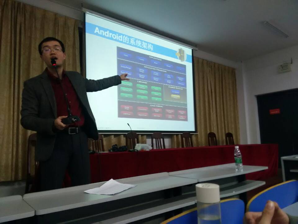 108教室内,中信集团的两名老师,用风趣的语言,和自身的实际经历,为同学们讲解了程序员的学习工作历程。课后,老师又给大家讲解了Android系统构架及其具体作用。