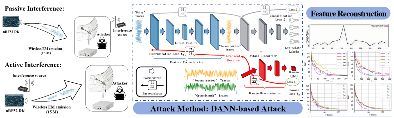 远场电磁侧信道攻击常受制于环境噪声与干扰,导致其攻击效率远低于预期。为克服这一瓶颈,本文提出一种基于域对抗迁移模型的增强型攻击方法(DAR-NN),以实现对密码芯片密钥的高效、鲁棒地远程窃取。该方法面向物联网终端射频设备,旨在为其在实际部署环境中的安全性测评,提供一种抗噪能力更强、适应性更优的解决方案。