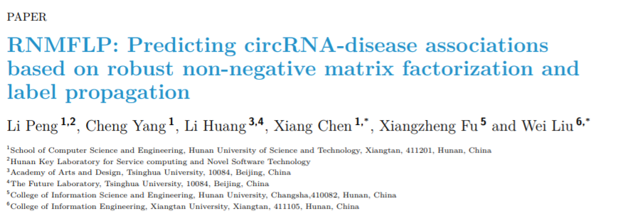 近日,我院彭理副教授团队在生物信息数据分析处理方向取得新进展。最新研究成果论文“RNMFLP: Predicting circRNA-disease associations based on robust non-negative matrix factorization and label propagation”,被国际公认的《Briefings in Bioinformatics》权威期刊录用,该期刊2021年影响因子/JCR分区:11.622/Q1,是生物信息处理领域的国际顶级权威期刊。