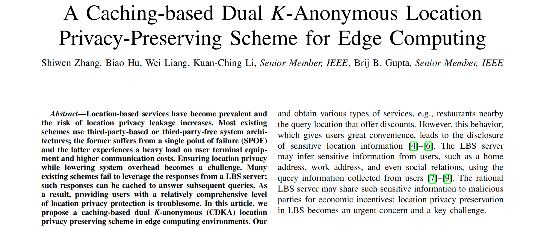 随着基于位置服务的发展,位置隐私保护已经成为了一个至关重要的问题。该研究成果提出了一种在边缘计算环境下基于缓存的双K匿名的位置隐私保护方案。该方案建立了一套位置隐私指标和缓存命中贡献指标评估匿名集,并设计了一种双K匿名算法。实验结果表明,本方案较其他几种方案具有更低的系统开销以及更优秀的隐私保护性能。
