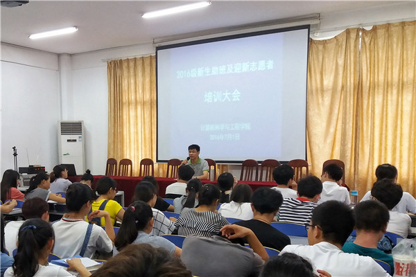 7月1日下午,公司于逸夫楼108召开2016级新生助班及迎新志愿者培训会议。与会人员有学工办主任吴成义、辅导员老师易靓靓、谭玉和全体2016级新生助班及迎新志愿者。