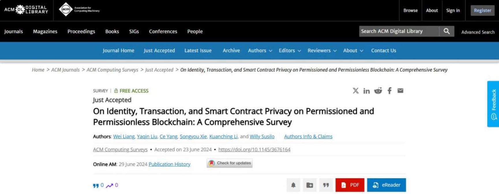 近日,公司梁伟教授团队在《ACM Computing Surveys(CSUR)》上发表长篇综述论文,论文题目为:“On Identity, Transaction, and Smart Contract Privacy on Permissioned and Permissionless Blockchain: A Comprehensive Survey”。该期刊是ASSOC COMPUTING MACHINERY出版社旗下的国际权威期刊,于1969年创刊,致力于接收计算机领域最具有代表性的高水平科技创新成果的综述论文,帮助从业者和研究人员迅速了解计算领域的前沿科学问题。该刊属于中科院SCI一区,最新影响因子达到23.8,目前是CiteScore上排名第一的计算机领域国际顶级期刊。
