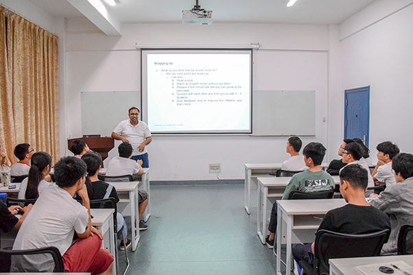 紧接着,在Karim Alinani一段简短的自我介绍后,英语俱乐部的第一次学习交流活动正式展开。Karim Alinani将此次英语学习交流活动分为“工作、学习、交流”三个不同的板块,他借用Listening、Speaking、Reading、Writing四个关键词,分别从听、说、读、写四个方面向在场同学分享了提高英语口语能力的方法,并向大家强调了英语口语在实际生活中的重要性。同时,他也倡导在座的每位同学在学习交流的过程中不要害羞,要多尝试用英语去表达自己的想法。活动期间,外教还与同学们分享了国外文化,并让同学们自由提问,问题涉及如何学好英语、如何提高口语能力等方面。整个过程大家畅所欲言,各抒己见,外教以其独特的交流方式吸引了许多同学,同学们踊跃参与其中,纷纷上台通过英语展现自我,大大增强了他们学习英语的信心,现场气氛十分轻松愉快。