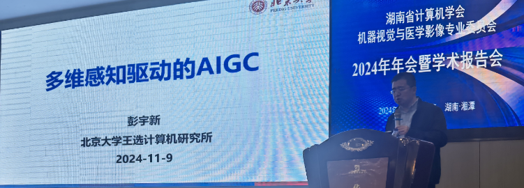 大会特邀报告由湖南大学陈浩教授和骆嘉伟教授、以及湘潭大学的胡凯教授主持。会中,北京大学彭宇新教授,北京邮电大学马占宇教授,北京航空航天大学郝爱民教授,中南大学奎晓燕教授,yl23455永利集团梁伟教授,解放军总医院第六医学中心放射科程流泉教授,分别围绕“多维感知驱动的 AIGC”、“手绘草图语义分割方法研究”、“医学虚拟仿真技术研究及创新实践”、“基于迭代协作的磁共振图像超分辨率方法”、“基于医学影像的肿瘤精准放疗自动计划关键技术研究”“ 基于 AI 的乳腺背景实质强化的定量测量与分级”主题做特邀报告。