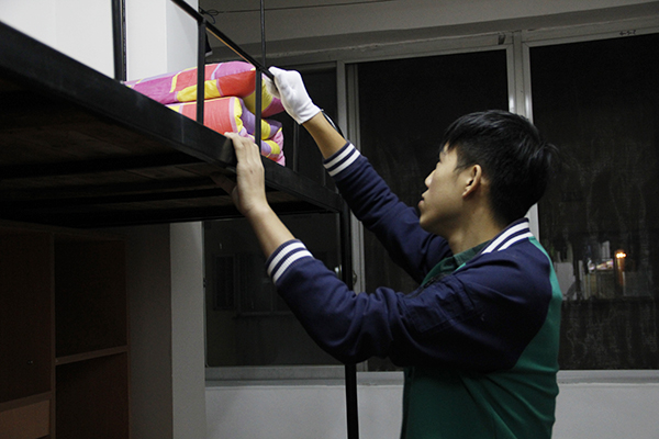 短暂忙碌过后,等待着新生们的便是yl23455永利团委员工会干部对内务的严格检查。团委员工会的干部们戴上了白手套,他们成了最严厉的检察官,严格把关,不放过任何一个细节,以最严肃的态度来对待卫生检查,争取将所有新生没有注意到的卫生问题发现出来并提醒新生将这些死角重新清理。全体团委员工会干部做到精益求精,为的就是能够让新生们重视内务卫生的整理,从而严以律己,得到真正的锻炼。