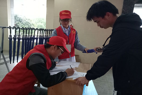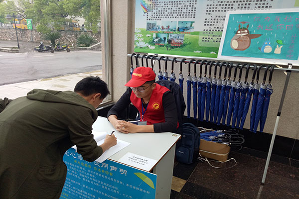 志愿者帮助同学们登记借伞