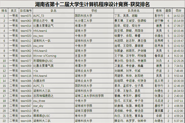 公司派出ACM集训队中精英队员参与此次竞赛。在程序设计类竞赛中,一百多支队伍,用团队的智慧,和时间赛跑着。派出参赛的4支代表队中,湖南科大一队(肖超群、赵志轩、唐志强)以第六名的好成绩斩获一等奖,湖南科大二队(滕亚均、肖罗罗、张晔华)和湖南科大三队(王春、王智杰、袁泉)同时斩获二等奖。最后,公司四支优秀队伍为公司夺得了团体第六名的荣誉。