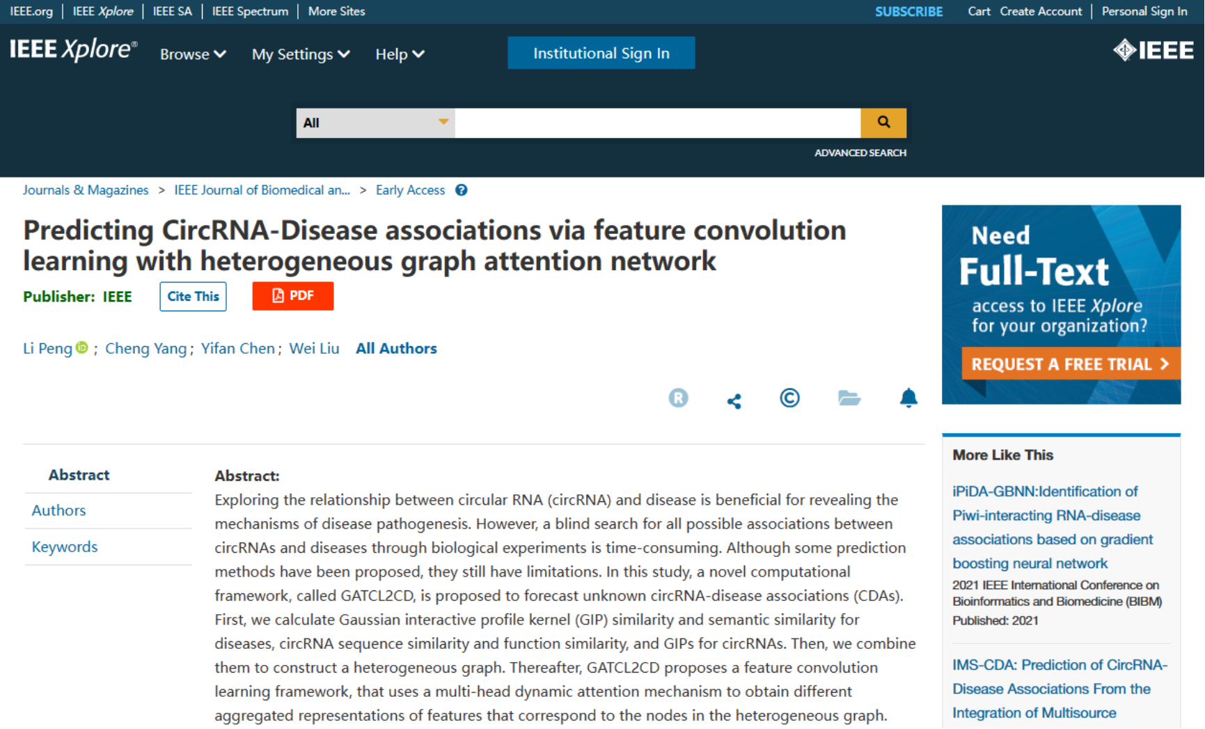 近日,公司彭理副教授团队在智能生物信息处理领域取得新进展,相关研究成果论文“Predicting CircRNA-Disease associations via feature convolution learning with heterogeneous graph attention network” 被国际顶级期刊《IEEE Journal of Biomedical and Health Informatics》录用,该期刊属于中科院一区,Top期刊,影响因子:7.021。