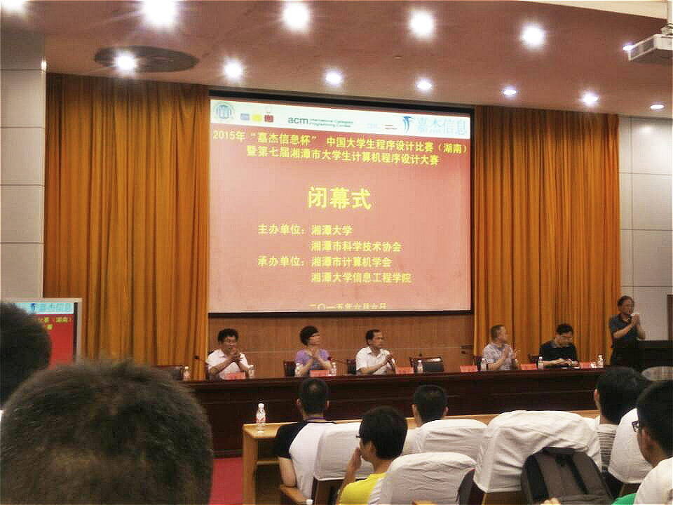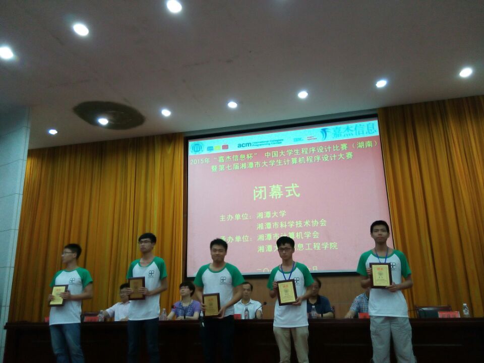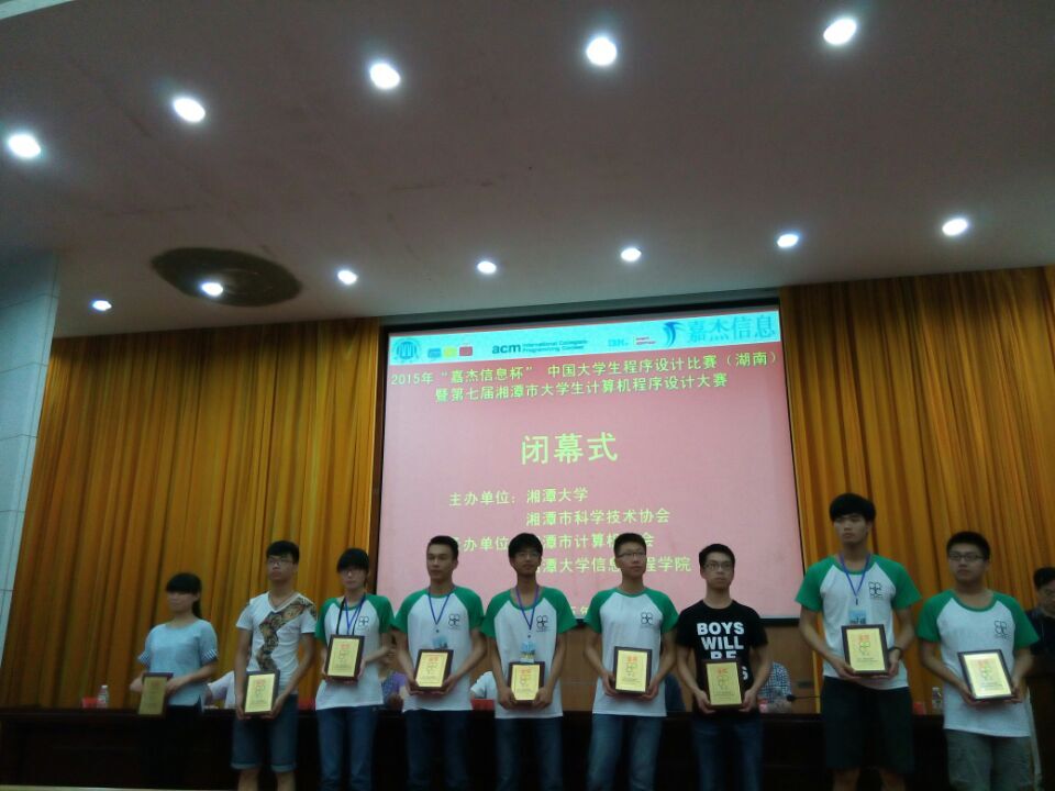 6 月6日,在2015 “嘉杰信息杯”中国老员工程序设计竞赛(湖南) 暨 第七届湘潭市程序设计竞赛中,公司9支代表队中有7支队伍获奖,其中由数学公司12级周朝苑、公司12级封宇、公司13级唐汉英组成的“奇袭小分队”获得 金奖。该赛事有来自全国46所高校的122支队伍参加,最终榜单链接为:http://202.197.224.59/rank/。