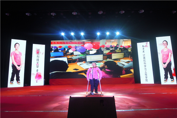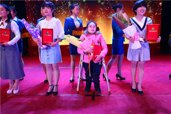 经过初选,网络投票及现场评选等环节,共有10位优秀女生脱颖而出参与此次报告会,她们用青春浇灌梦想,勇敢、坚毅、拼搏,她们是时代的骄子。其中来自公司15级网络工程二班的廖莎莉,虽患先天性脆骨病,却用惊人的毅力和信心抗击着命运带来的苦难,以芳菲为翼,搏击人生,她用拐杖站在台上的那一刻,台下已掌声雷动。“整整高中三年都在学习走路”,谈及生活艰苦之处,廖莎莉面带苦尽甘来的微笑如是说道。