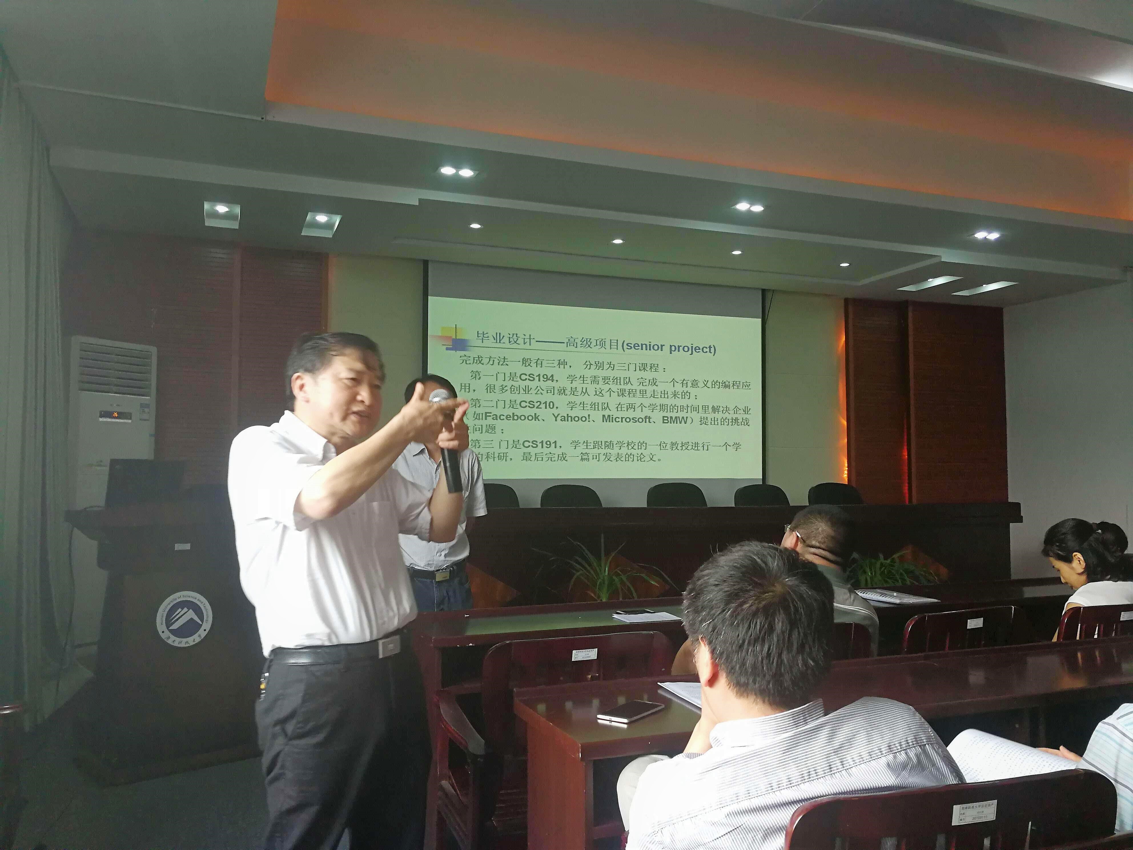 李仁发从计算机专业性最强的世界高校,斯坦福大学的课程设计、培养目标出发,与大陆本科高校计算机专业做了详细对比,以“整顿教学秩序、丰富学术研究、加强技术创新、完善公司培养目标”四个方面为题,旨在找出计算机专业确定培养目标的科学方法和培养人才的合理方式。他认为按“国际工程教育专业认证”标准办学,就是我们努力的方向。他还就老师们提出的具体问题,与大家进行了互动交流。