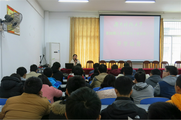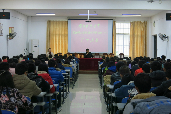 吴老师在大会上回顾了前几期入党积极分子的培训情况,对往届同学们的学习情况作出肯定,也期待在新的一期培训班中同学们能取得更优秀的成绩。吴老师对有这么多同学在思想上向党靠拢深感欣慰,同时要求大家不但要在思想上入党,在行动上也要向党靠拢。肖老师对这次入党积极分子培训提出具体要求,入党积极分子要求在上课之前提前30分钟排队进教室,不得无故旷课,迟到达两次则立即取消入党积极分子的资格,在培训班中大家要对号入座,同时向大家讲解这次培训的课程安排和对同学们的这次培训提出期望。
