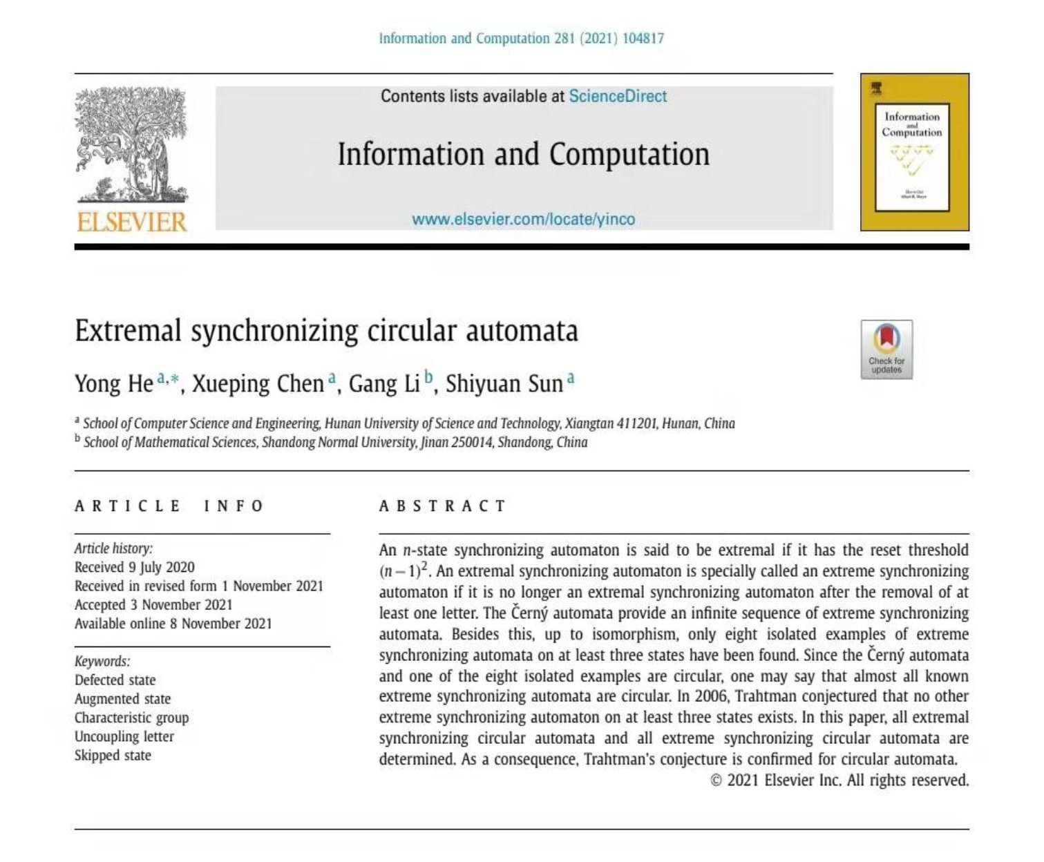 何勇教授团队长期致力于同步自动机领域的研究,近期在该研究方向取得新进展。研究成果以“Extremal synchronizing circular automata”为题,于2021年12月8日在线发表于Information and Computation杂志上,该期刊是中国计算机学会(CCF)指定的A类学术期刊。