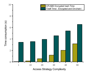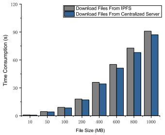当前区块链个人数据隐私保护方案存在着显式存储、用户细粒度访问控制困难、数据缺乏透明度与可审计性等问题,面对这些问题与挑战,梁伟教授等人提出了一种基于联盟区块链的个人数据隐私保护方案,该方案首次使用改进的Paillier同态加密机制加密存储原始数据。联盟区块链结合分布式私有集群存储加密数据,通过链下存储和链上传输的协同,提高数据传输效率,保障用户隐私和安全。同时提出基于密文策略属性加密来实现细粒度的访问控制。所提出的隐私保护方案分别加速了现有解密运行时间与加密运行时间25%和48%,文件加密上传时间与下载时间如下图所示。