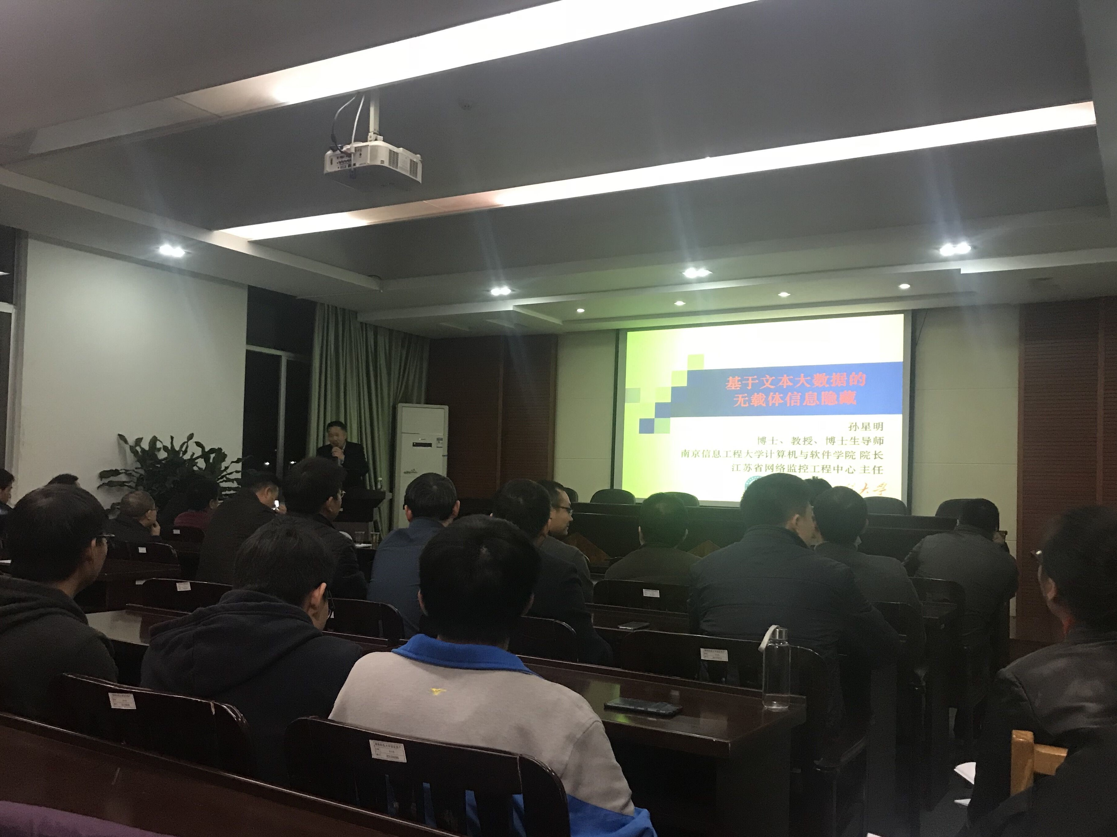 11月27日晚上8点,南京信息工程大学计算机与软件公司经理孙星明教授应邀在逸夫楼201报告厅做了题为“基于文本大数据的无载体信息隐藏”的学术报告。yl23455永利老师和部分研究生、本科生参加了此次报告会,讲座由经理刘建勋主持。