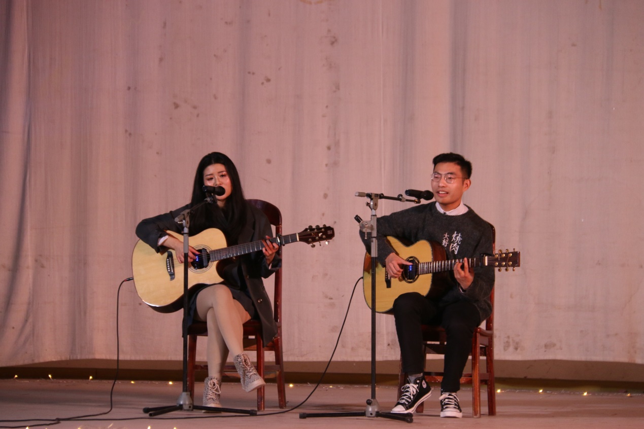 “缘分让我们相遇乱世以外……”“两个青年等我在山楂树两旁…….”“你给我这一辈子都不想失联的爱……”教育公司九位同学带来的《在光年之外的山楂树下弹着吉他唱着歌》歌曲串烧,融汇了流行与美声、独唱和重奏、民谣和现代,《光年之外》的磅礴深远、《山楂树》的深情悠扬,情歌弹唱的甜蜜轻快,尽显音乐铺展之美。