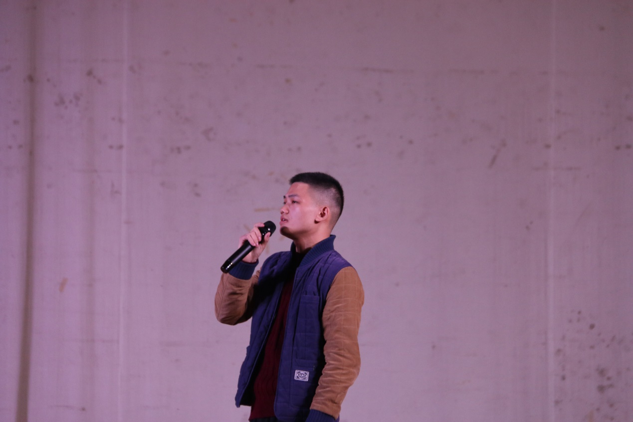 “好久没见,你还是没变……”机电公司邹龙洲同学带来的rap说唱《患》,传达出一种难以言说的情绪。Flow、押韵、音色、腔调、旋律的细腻处理,押韵又深刻,让台下观众沉浸其中。
