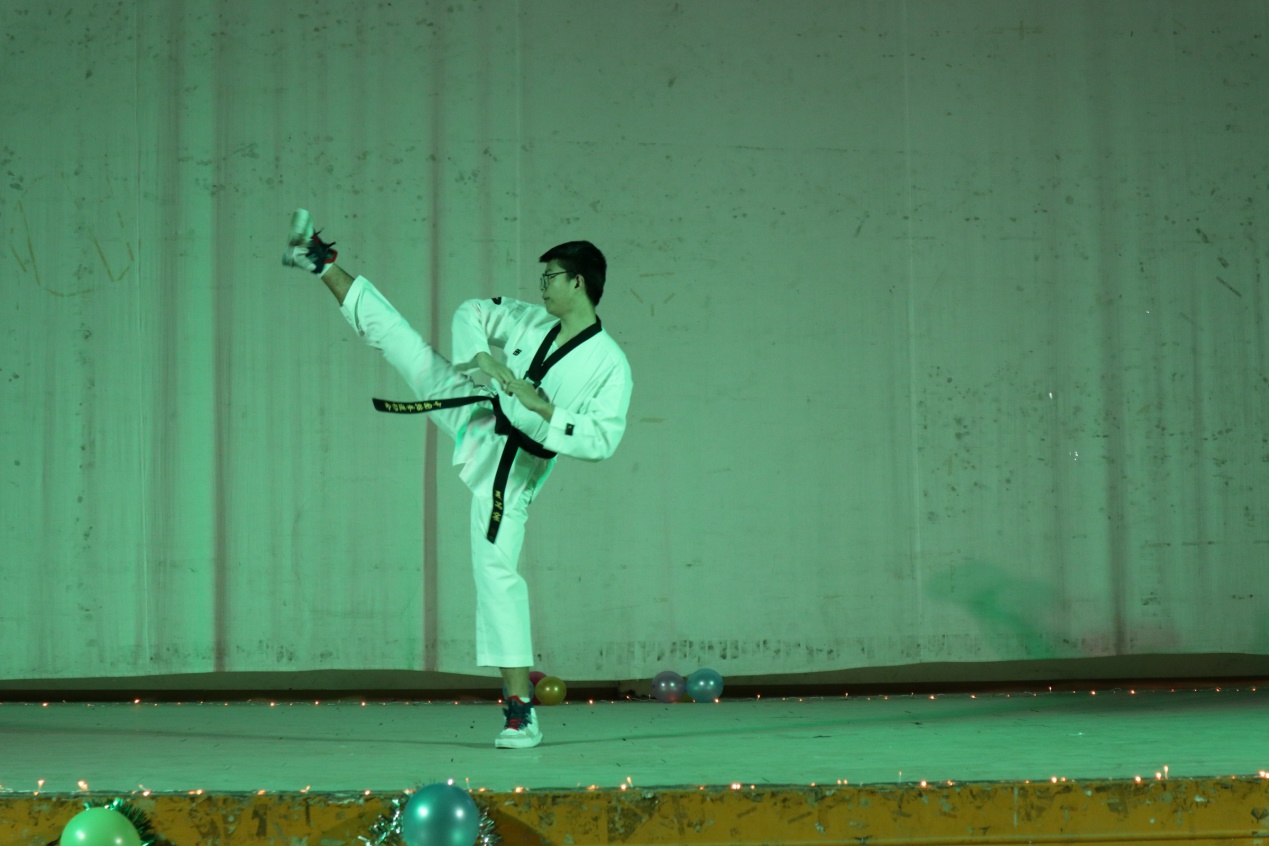 手刀攻击、贯手、侧踢、中段外接招……由机电公司夏昺宸同学带来的跆拳道《品势五章》表演,融贯了技巧和力量,体现出跆拳道的博大精深,尤其是最后的踢板和单手劈钢条,赢得了在场师生的阵阵喝彩。