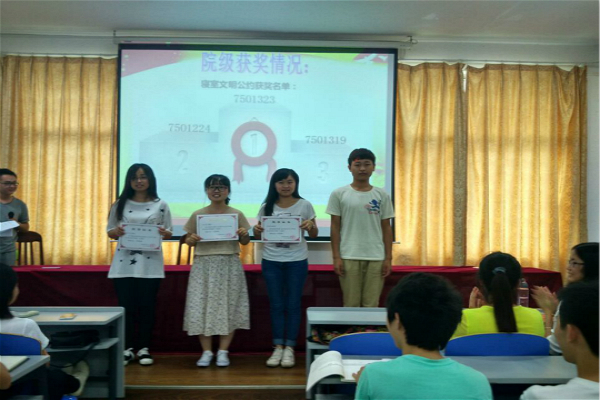 首先,由宿管部部长赵毅峰颁发了第九届寝室文化节院级优秀作品奖。其中包括摄影作品、手抄报、寝室文明公约、寝室标志大赛以及雅室设计。接着,就2014-2015学年晚归、卫生数据,总结了宿管部这一学年的工作。然后,进行了防诈骗主题宣讲,主要向大家介绍诈骗类型和典型案例,提醒大家务必提高警惕,注意安全。