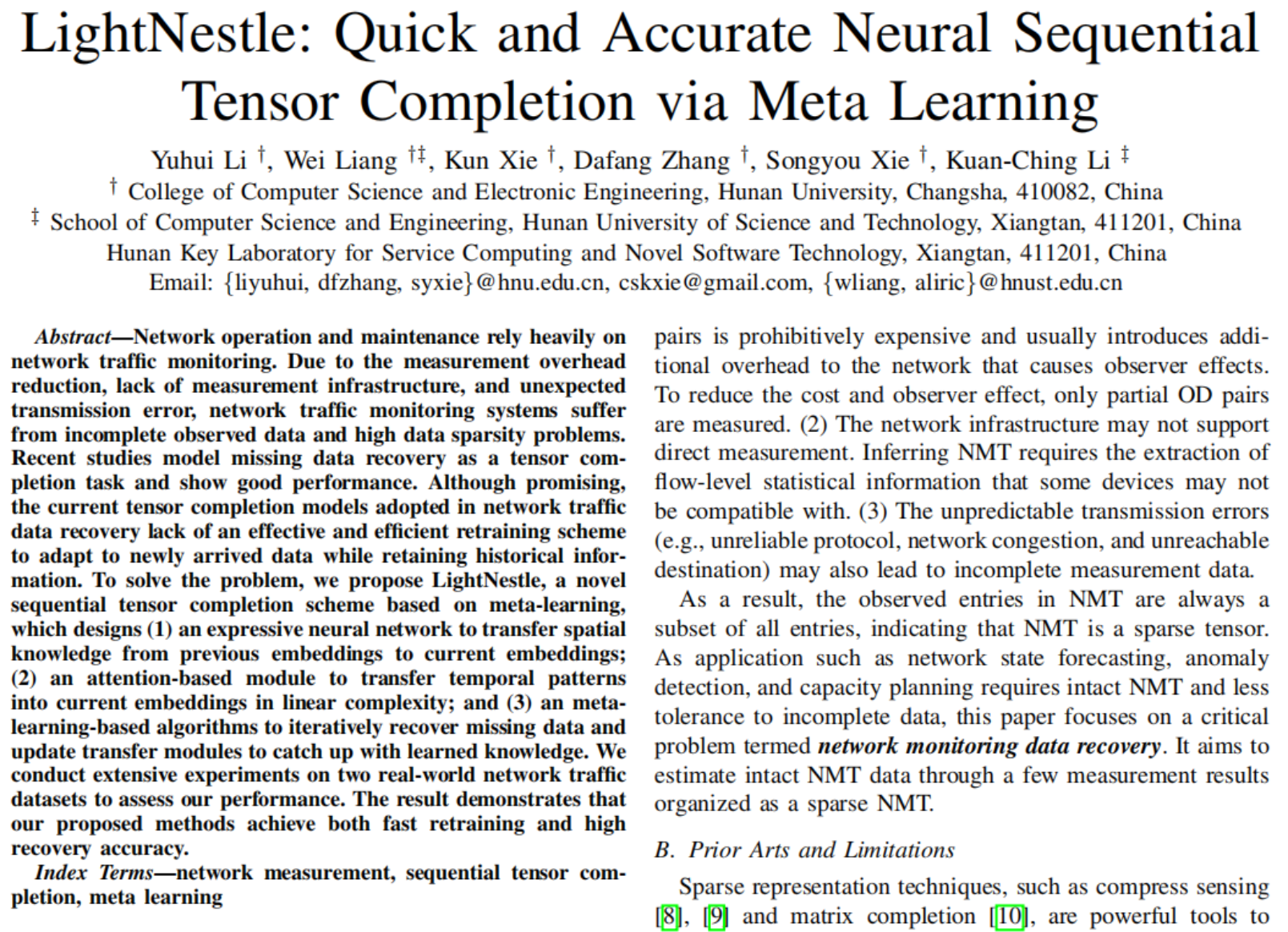 近期,公司梁伟教授团队在智能交通领域网络流量监控数据处理方向取得新进展。研究成果“LightNestle: Quick and Accurate Neural Sequential Tensor Completion via Meta Learning”于2022年12月3日被CCF A类国际顶级会议《IEEE INFOCOM》接收,该项研究成果将被国际顶级会议论文集收录,会议将由IEEE Communications Society在美国纽约举办,梁伟教授团队将作大会报告。《IEEE INFOCOM》是IEEE组织在通信网络领域的旗舰会议,此次会议共收到文章1312篇,接收论文252篇,录用率仅为19%。