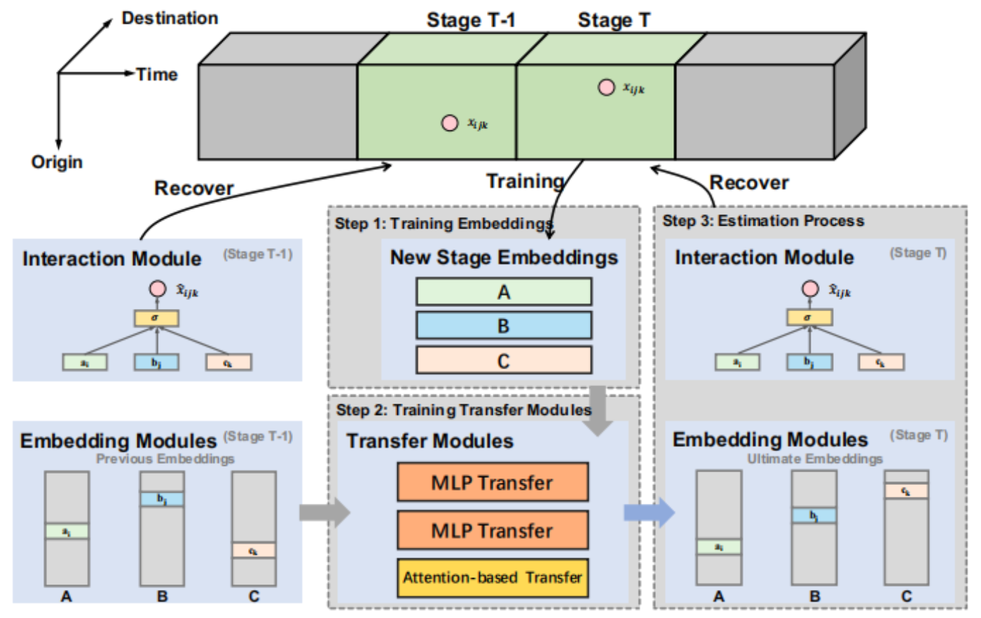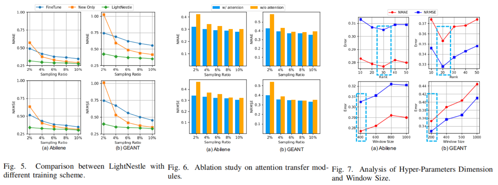 网络流量监控是网络管理的重要内容之一。现有网络流量监控面临着观测数据不完整、数据稀疏性高等诸多挑战。高效的数据恢复技术至关重要。但是通常采用的张量完成模型在保留历史信息的同时,缺乏一种有效、高效的再训练方案来适应新到达的数据。为此,梁伟教授团队提出了一种基于元学习的序列张量补全方案LightNestle(如下图所示)。方案融合了表达神经网络、注意力机制、元学习等先进计算理论与方法。实验结果表明,所提出的方法既实现了快速的再训练,又实现了较高的恢复精度。