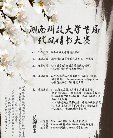 由公司计算机协会主办的首届代码情书大赛与4月20日圆满落幕。此次大赛面向全校同学征集作品,共收到来自15个公司的五十余份作品,经过大赛委员会的评选,于20日完成评奖工作。
